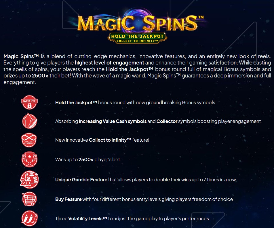 Magical Spin est le meilleur casino en ligne en France, reconnu par l'ANJ, qui propose tous les titres et des promotions jusqu'à 3000€. Vous pouvez profiter d'un pack de bienvenue attractif de 1 000 € + 220 FS. Avec plus de 3 200 titres disponibles, ce site inclut des titres populaires tels que Starburst™, Gonzo's Quest™, et Book of Dead™.